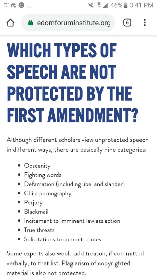 I Edomforuminstitute Org G E Which Types Of Speech Are Not Protected By The First Amendment Although Different Scholars View Unprotected Speech In Different Ways There Are Basically Nine Categories Obscenity Fighting Words
